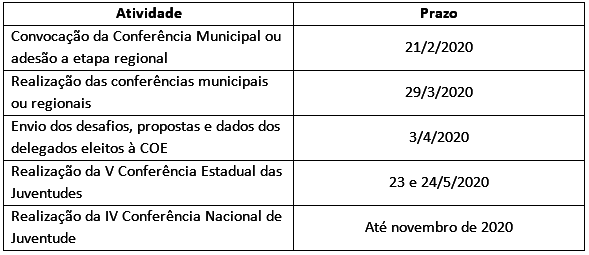 A agenda 2020 já começou (veja quadro na página) e os municípios têm até o dia 21 de fevereiro para convocar suas Conferências Municipais da Juventude ou aderir à etapa regional. Todas as cidades deverão se cadastrar junto à Comissão Organizadora Estadual (COE), vinculada à Secretaria de Estado de Desenvolvimento Social (Sedese), neste link.