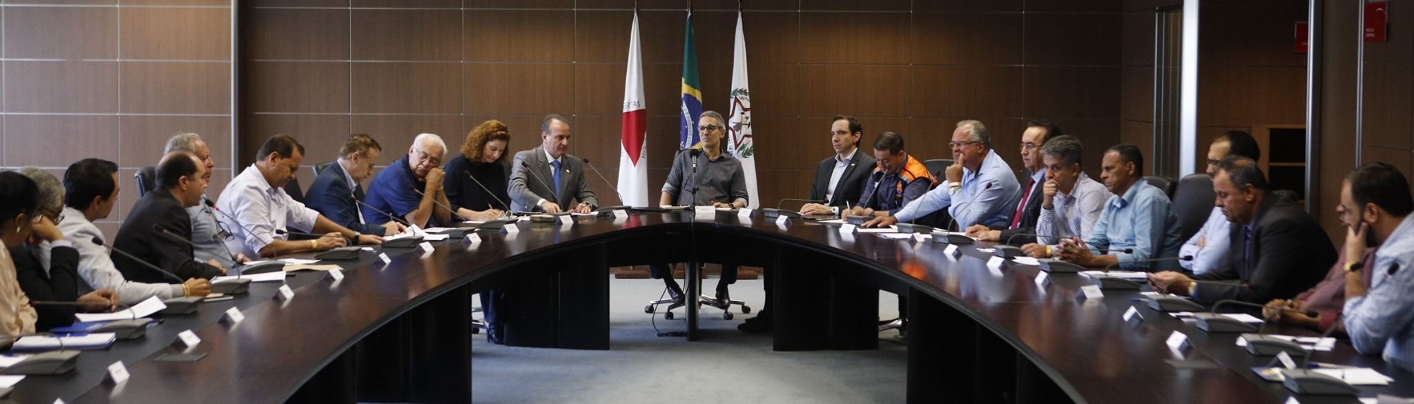 O governador de Minas, Romeu Zema, recebeu nesta sexta-feira (31/1), na Cidade Administrativa, 22 prefeitos, que integram a Associação dos Municípios da Região Metropolitana de Belo Horizonte (Granbel), que tiveram suas cidades afetadas pelas chuvas dos últimos dias. Junto com os secretários Marco Aurélio Barcelos (Infraestrutura e Mobilidade), Elizabeth Jucá (Desenvolvimento Social) e Bilac Pinto (Governo), além do coordenador-adjunto da Defesa Civil de Minas, tenente-coronel Flávio Godinho, Zema explicou aos prefeitos como o estado tem atuado para facilitar o acesso a recursos federais, obter doações dos órgãos estaduais e apoio para a reconstrução dos municípios.