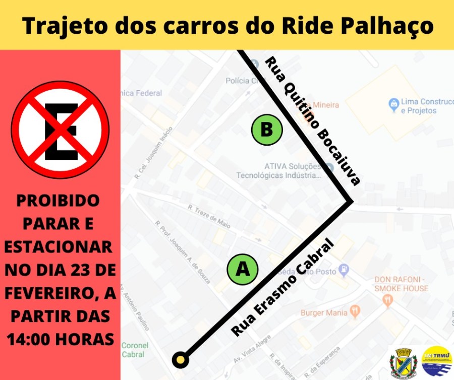 Trajeto dos carros alegóricos do Bloco Ride Palhaço no domingo, dia 23 de Fevereiro