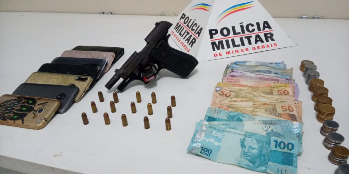 O garupa foi preso com uma PT 380, municiada com 15 cartuchos e uma mochila com os produtos dos roubos.
