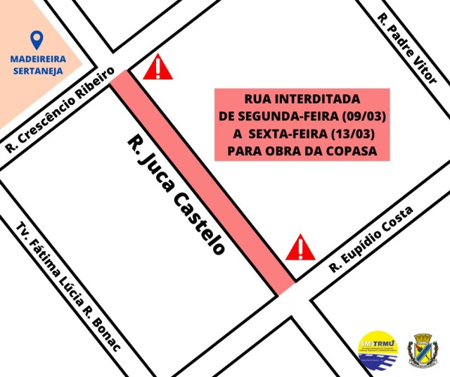 Em Santa Rita do Sapucaí, a Secretaria Municipal de Transporte, Trânsito, Rodoviário e Mobilidade Urbana comunica que em virtude de uma obra emergencial da COPASA, a Rua Juca Castelo entre as ruas Dr Eupídio Costa e Crescêncio Ribeiro está fechada ao trânsito do dia 09 ao dia 13 de março.