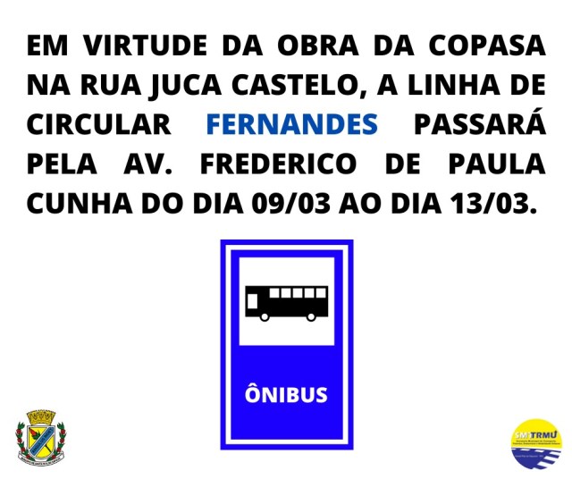 E em virtude dessa obra o circular do bairro Fernandes passará pela Av. Frederico de Paula Cunha.