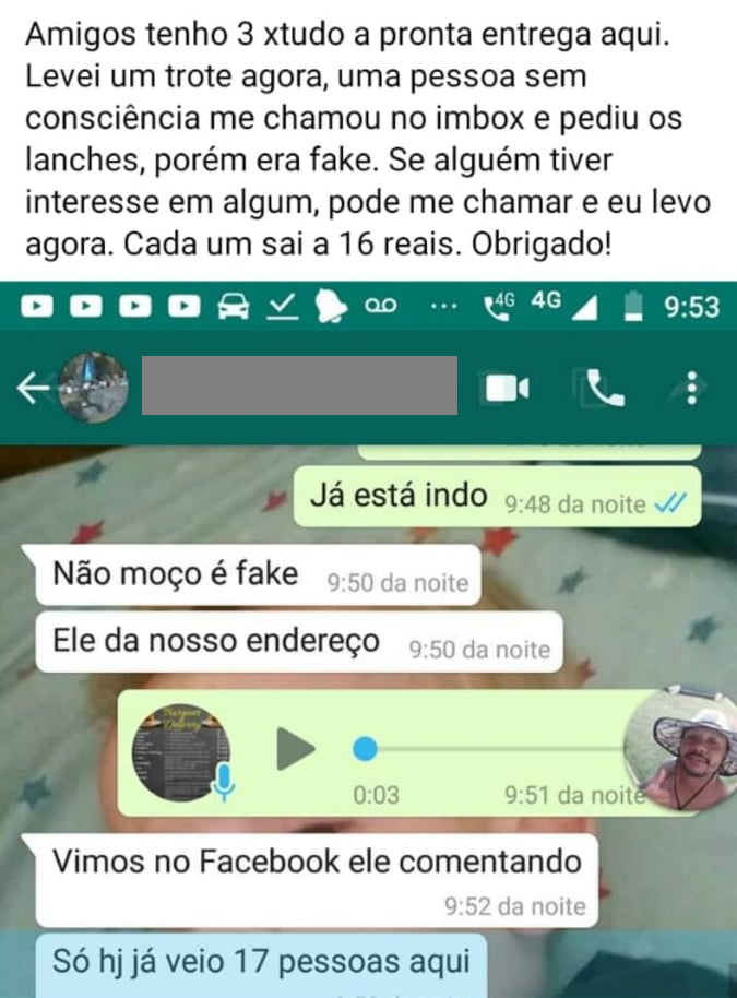 Ontem, três sanduiches foram pedidos para serem entregues em um endereço próximo à APAE (este endereço é o que vem sendo usado por este fake e outros para atacar, difamar e denegrir algumas pessoas).