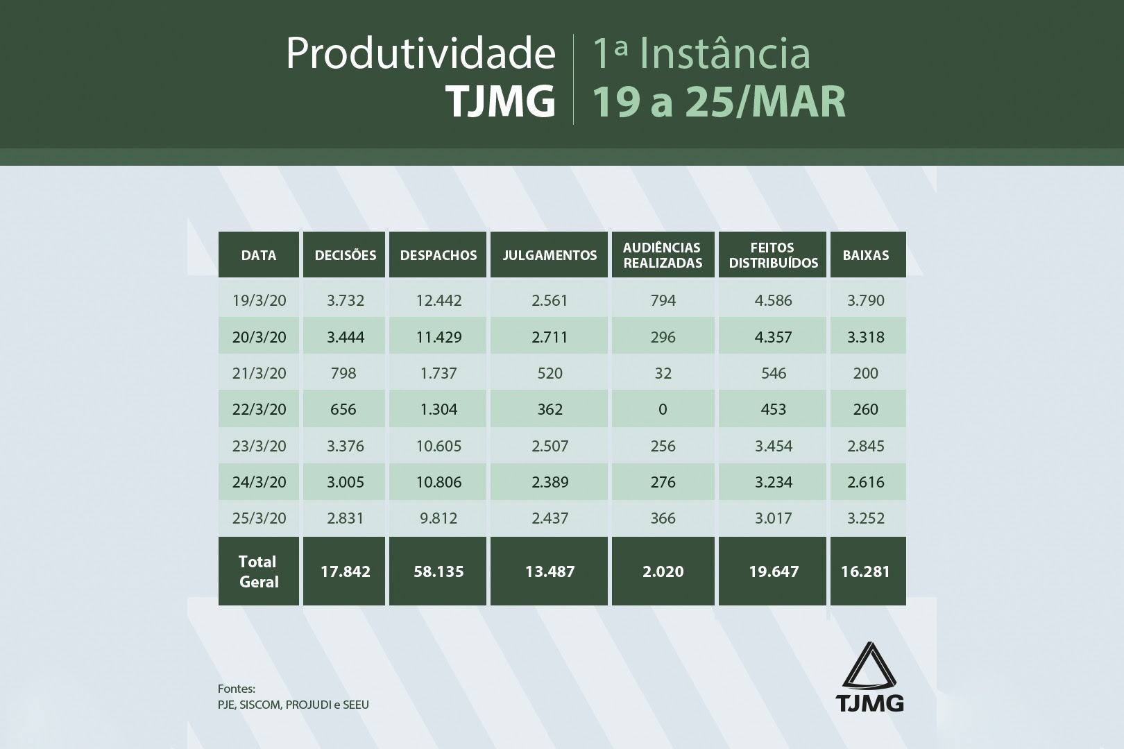 Em sete dias dessa nova realidade, de 19 a 25 de março, incluindo o sábado (21/3) e o domingo (22/3), a Justiça de Primeira Instância, em Minas, demonstrou que não houve queda da produtividade: proferiu quase 60 mil despachos. No período, foram proferidas ainda mais de 30 mil sentenças/decisões e realizadas aproximadamente 2 mil audiências. Quase 20 mil feitos foram distribuídos e mais de 16 mil baixas foram efetuadas.