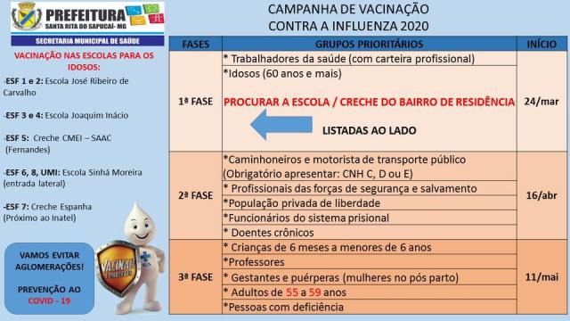 A Secretaria de Saúde de Santa Rita do Sapucaí, dando continuidade na 2ª fase da Campanha de Vacinação contra a Influenza, inclui na 2ª fase os caminhoneiros e motoristas de transporte público, e na 3ª fase serão incluídos os professores, conforme estabelecido pelo Ministério da Saúde.