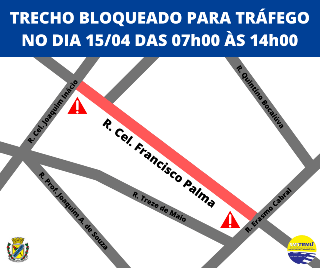 A Secretaria Municipal de Transporte, Trânsito, Rodoviário e Mobilidade Urbana comunica que quarta-feira, dia 15/04, das 07h00 às 14h00, a Rua Cel. Francisco Palma ficará fechada ao trânsito entre as ruas Cel. Joaquim Inácio e Erasmo Cabral.
