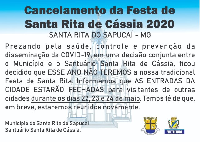 Prezando pela saúde, controle e prevenção da disseminação da COVID-19, em uma decisão conjunta entre o município e o Santuário Santa Rita de Cássia, ficou decidido que ESSE ANO NÃO TEREMOS a nossa tradicional Festa de Santa Rita.