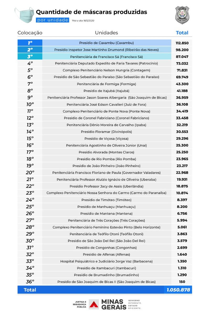 O diretor-geral do Departamento Penitenciário de Minas Gerais, Rodrigo Machado, destaca o trabalho dos profissionais que atuam diretamente com os presos. “Meus agradecimentos a diretores regionais, diretores de unidades prisionais e policiais penais, que garantiram disciplina e ordem nas unidades para execução da tarefa, e também aos demais profissionais envolvidos com o processo de produção”. De acordo com o diretor-geral, ao praticamente dobrar a meta inicial prevista, de 22 mil máscaras por dia, o sistema prisional mostra que há condições de se investir em outras produções fabris que deem sustentabilidade para o Depen-MG, como a confecção de uniformes.