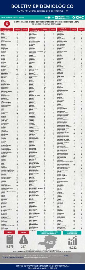 Dados parciais, sujeitos a alterações. Atualizado em 29/05/2020. Fonte: COES MINAS/COVID-19/SES-MG.