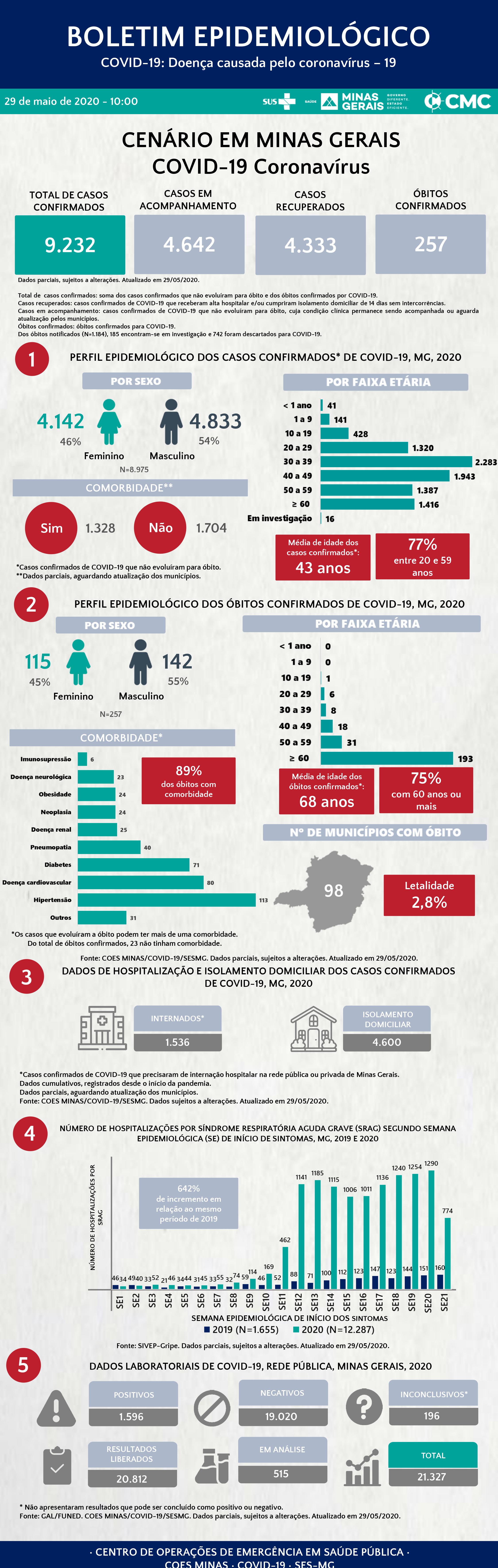 Dados parciais, sujeitos a alterações. Atualizado em 29/05/2020. Fonte: COES MINAS/COVID-19/SES-MG.