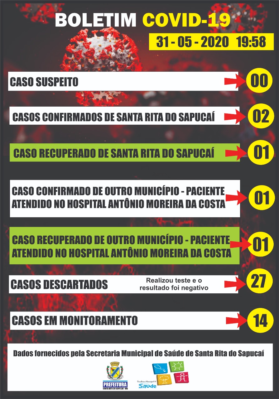 O único caso suspeito de Santa Rita do Sapucaí, testou negativo e passou a constar em nosso boletim como caso descartado.