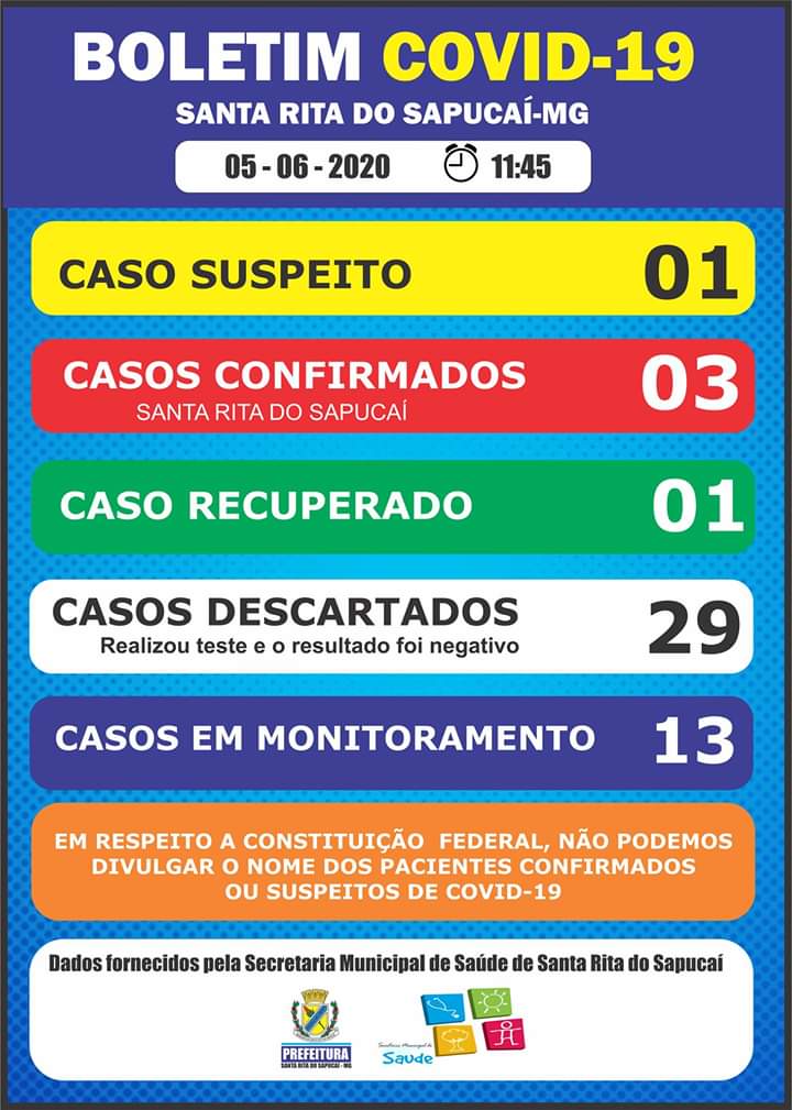 (O novo caso confirmado não constava como caso suspeito em nossos boletins, pois foi notificado em outro município, mas como a pessoa que testou positivo é de Santa Rita do Sapucaí passa a constar agora em nossos boletins).