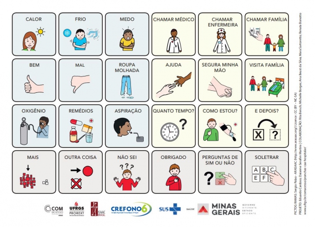 Durante a internação hospitalar, alguns pacientes acometidos pela forma grave da covid-19 podem fazer uso de ventiladores mecânicos ou de outros procedimentos que limitam ou impedem a comunicação oral. Pensando em facilitar a interação entre essas pessoas e a equipe de cuidados, a Secretaria de Estado de Saúde de Minas Gerais (SES-MG), em parceria com o Conselho Regional de Fonoaudiologia (Crefono), vai distribuir 3 mil kits de pranchas de comunicação alternativa para as unidades de Saúde.