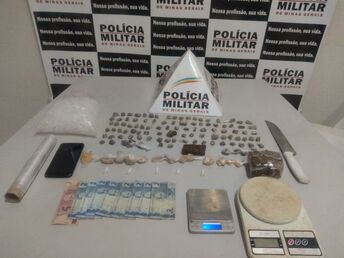 Os militares deslocaram até o local, onde abordaram o menor de 17 anos, que entregou aos militares três tabletes grandes de maconha, dois tabletes pequenos e algumas buchas de maconha e pedras de crack. Também foi apreendido com o autor duas balanças de precisão, uma faca de cozinha, um rolo de papel filme, um pacote de pinos vazios e o valor de vinte e um reais em moeda corrente.