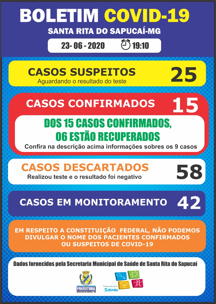 Desses 15 casos confirmados, 06 já não tem mais o vírus, estão RECUPERADOS (curados),