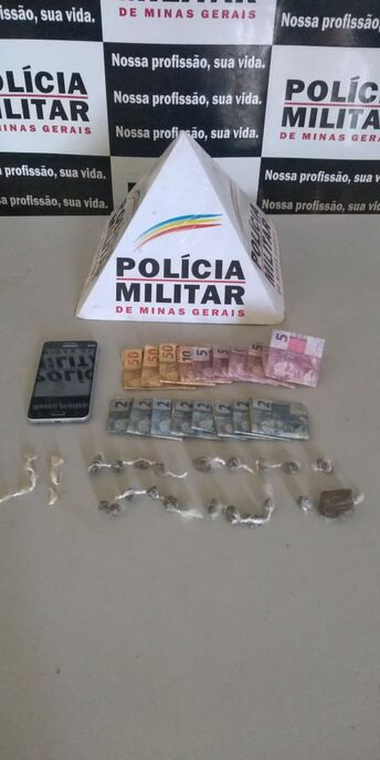 O menor foi abordado sendo encontradas 07 (sete) pedras de Crack e a quantia de R$ 100,00 (cem) reais em moeda corrente. Ao empregar o cachorro de carga da PMMG localizou-se também 18 (dezoito) buchas de Maconha, 1 (um) tablete pequeno prensado de maconha e mais a quantia de R$ 101,00 (cento e um) reais.