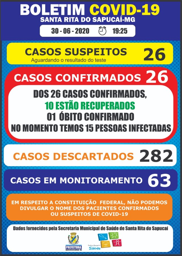 Desses 26 casos confirmados, 10 já não tem mais o vírus, estão RECUPERADOS (curados), e tivemos 01 óbito – Mulher de 51 anos que possuía comorbidade (situação em que um indivíduo possui alguma doença em conjunto com outra).