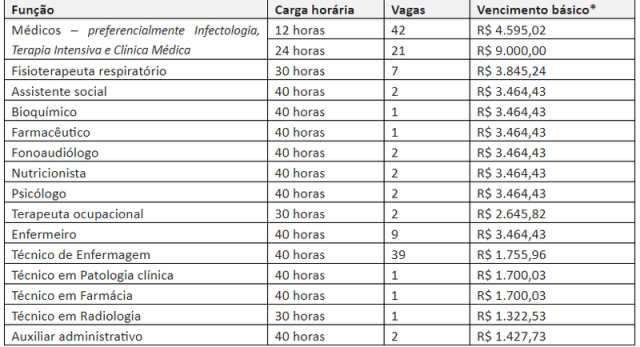 Os vencimentos básicos do chamamento emergencial variam entre R$ 1,3 mil a R$ 9 mil e são oferecidas vagas para médicos, fisioterapeutas respiratórios, assistentes sociais, bioquímico, farmacêutico, fonoaudiólogos, nutricionistas, psicólogos, terapeutas ocupacionais, enfermeiros, técnicos de enfermagem, técnico em patologia clínica, técnico em farmácia, técnico em radiologia e auxiliares administrativos (veja na tabela abaixo).