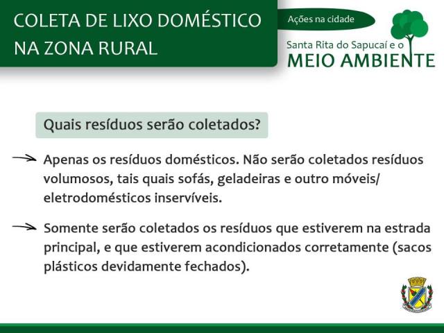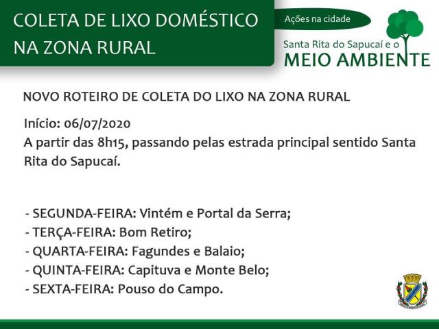 Em Santa Rita do Sapucaí, o projeto piloto de coleta de lixo doméstico na zona rural teve início no mês de maio no bairro Fagundes, em seguida no bairro Bom Retiro, e a partir de segunda-feira, dia 06, abrangerá toda zona rural, de acordo com cronograma abaixo: