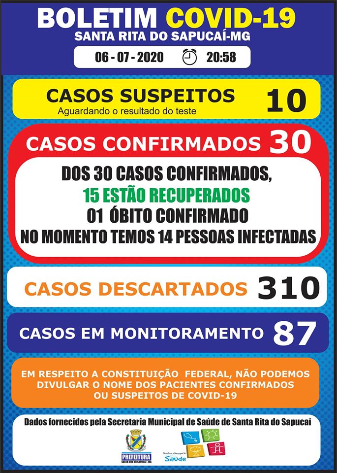 Desses 30 casos confirmados, 15 já não tem mais o vírus, estão RECUPERADOS (curados), e tivemos 01 óbito.