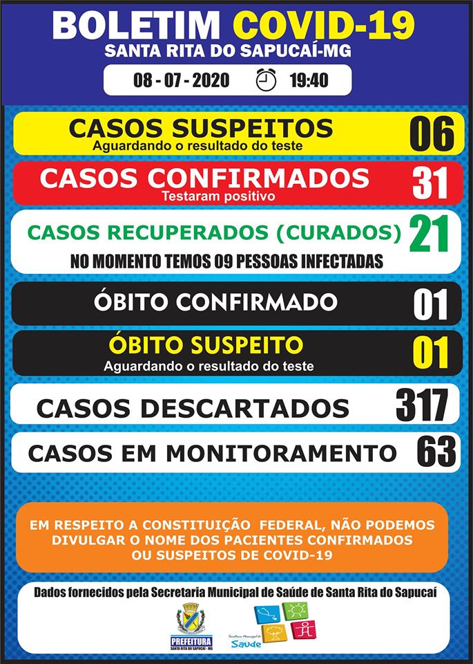 Desses 31 casos confirmados, 21 já não tem mais o vírus, estão RECUPERADOS (curados), e tivemos 01 óbito.
