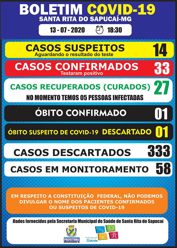 Hoje temos 5 pessoas infectadas no município de Santa Rita do Sapucaí.