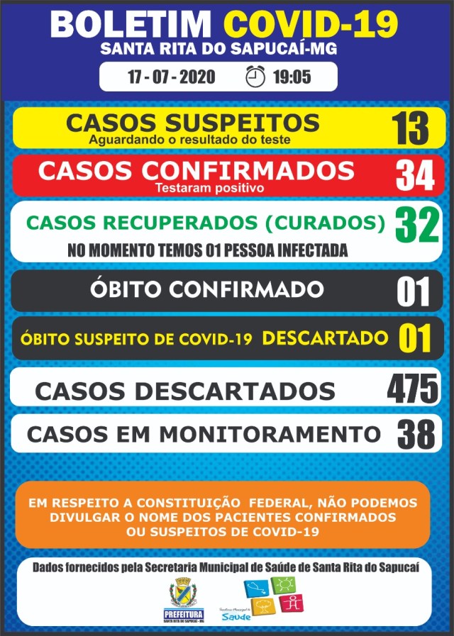 Dos 34 casos confirmados, 32 já não tem mais o vírus, estão RECUPERADOS (curados), e tivemos 01 ÓBITO CONFIRMADO DE COVID-19;