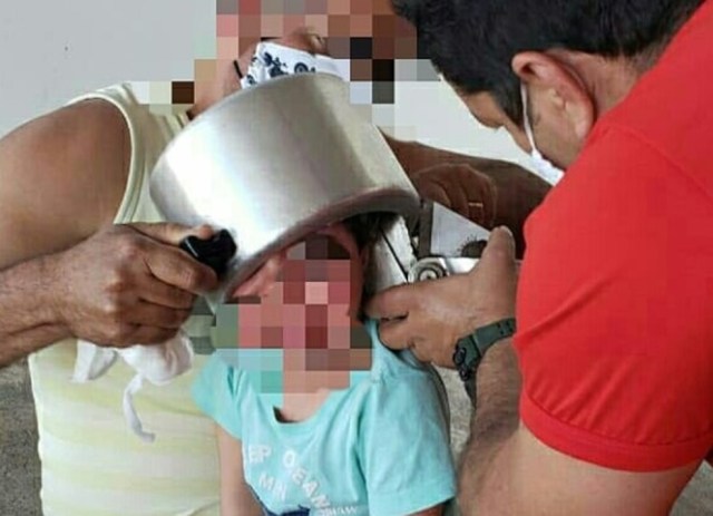 O Corpo de Bombeiros de Lavras atendeu uma ocorrência incomum esta semana. De acordo com os militares, um menino de dois anos estava brincando com uma panela de pressão e acabou ficando com o objeto preso na cabeça.