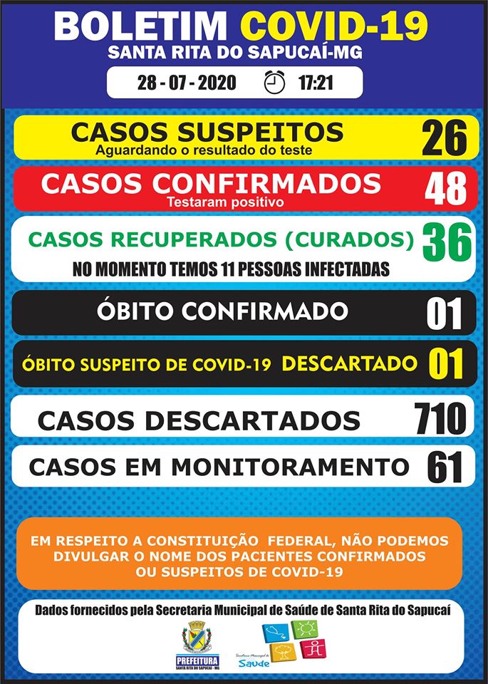 Dos 48 casos confirmados, 36 já não tem mais o vírus, estão RECUPERADOS (curados), e tivemos 01 ÓBITO CONFIRMADO DE COVID-19;