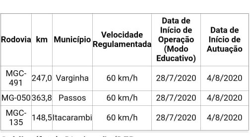 Três novos radares instalados em rodovias estaduais operam em caráter educativo até a próxima segunda-feira (3/8). Quem passa pela MGC-491, km 247, em Varginha; MG-050, km 363,8, em Passos; e na MGC-135, km 148,5, próximo a Itacarambi, deve ficar atento à nova sinalização e ao limite de velocidade dos trechos.