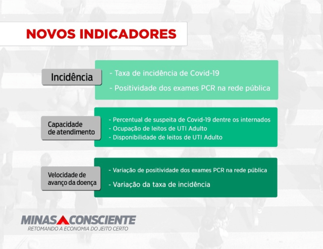 Os indicadores que norteiam a progressão de ondas do plano Minas Consciente foram reorganizados para darem um panorama mais amplo, claro e sistematizado dos protocolos e critérios a serem seguidos nas cidades mineiras.
