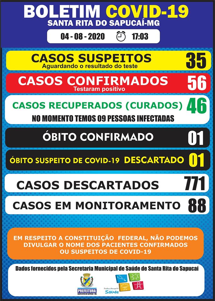 Dos 56 casos confirmados, 46 já não tem mais o vírus, estão RECUPERADOS (curados), e tivemos 01 ÓBITO CONFIRMADO DE COVID-19;