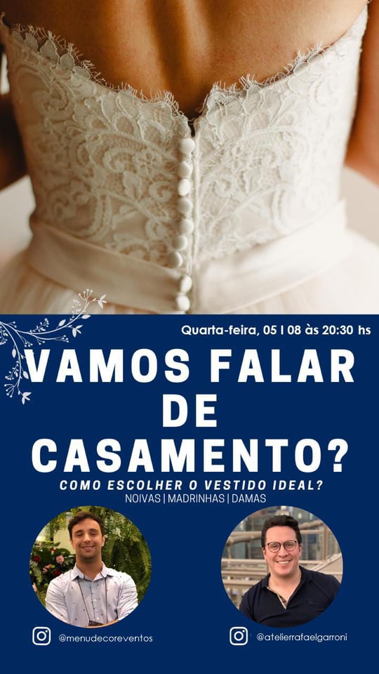 Nessa quarta feira , dia 05 as 20h30 irá acontecer nas redes sócias da empresa de eventos Menu Decor e do estilista Rafael Garroni um super bate papo com o tema vestido de noiva, vestido de madrinha e damas !