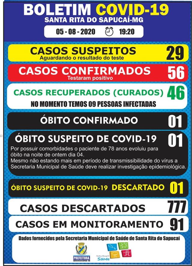 Importante lembrar que a Secretaria Municipal de Saúde de Santa Rita do Sapucaí, segue as determinações do Ministério da Saúde e Secretaria de Estado de Saúde para não haver divergências nas informações publicadas nos boletins do município.