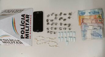 O cidadão foi abordado e localizaram-se a quantia de R$ 139,00 (cento e trinta e nove reais) em dinheiro, 01 (um) aparelho de celular, 27 (vinte e sete) buchas de maconha, 24 (vinte e quatro) pedras de crack e 13 (treze) pinos de cocaína.