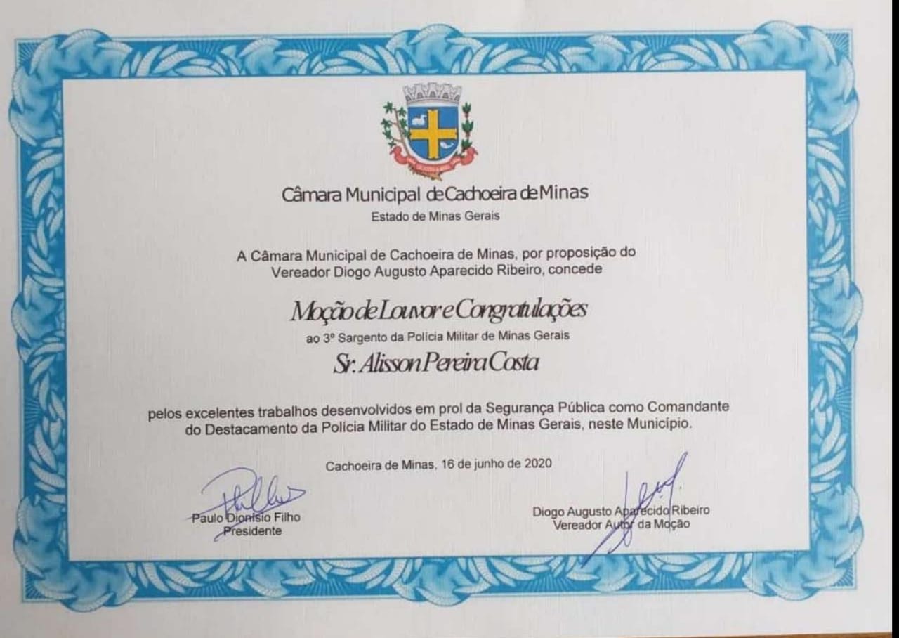 Em Cachoeira de Minas os vereadores Paulo Dionísio Filho e Diogo Augusto Aparecido Ribeiro, prestaram uma justa homenagem ao Sargento PM Alisson Pereira Costa, Comandante do Destacamento da Polícia Militar daquele município.