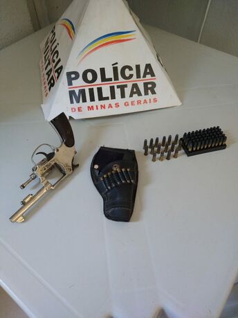 A equipe policial realizou buscas na residência do autor e recolheu um revólver cal.22 da marca Rossi, carregado com 7 munições, juntamente com outras 65 munições intactas do mesmo calibre.