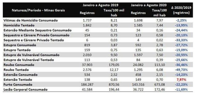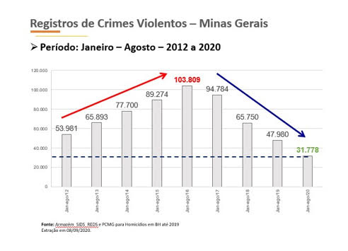 O índice geral de crimes violentos dos oito primeiros meses de 2020 foi 33,7% menor do que no mesmo período de 2019, com 16.202 ocorrências a menos. Em comparação ao ápice da criminalidade violenta em Minas, no ano de 2016, a queda é de 69,3%.