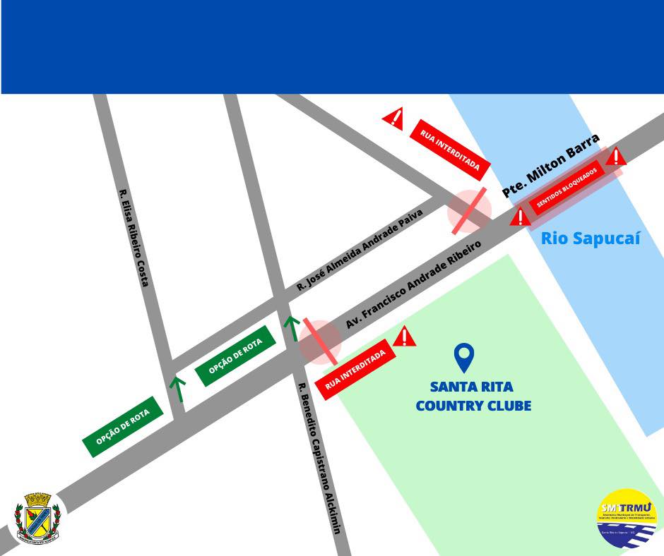 Em Santa Rita do Sapucaí, a Prefeitura Municipal informa que, devido à obra de contenção na cabeceira da Ponte Milton Barra, (Ponte de acesso à Praça Santa Rita), a partir de 7h do dia 13 de outubro de 2020, terça-feira, o trânsito de veículos na Ponte estará interditado, diuturnamente, em ambos os sentidos, pelo tempo que for necessário para a conclusão da obra e repavimentação do trecho.