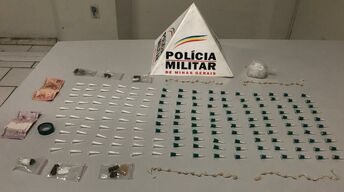 Na posse do menor foram encontrados 01 (uma) bucha de maconha e R$ 15,00 (quinze reais). Em buscas nas proximidades, foram encontrados em um lote vago uma sacola contendo 156 (cento e cinquenta e seis) pinos de cocaína, 52 (cinquenta e duas) pedras de crack, 05 (cinco) buchas de maconha e materiais para embalar drogas.