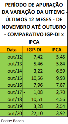 A ideia é que, para fins de atualização da Ufemg, seja levado em conta sempre o menor índice. Isso porque a correção do valor da Unidade Fiscal é baseada na variação do índice de inflação ocorrida entre novembro de um ano e outubro do ano seguinte.