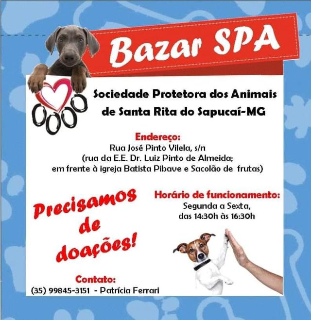 A Sociedade Protetora dos Animais de Santa Rita do Sapucaí tem um bazar, no qual todo o dinheiro é revertido para a ONG, e está precisando muito de doações de roupas, calçados, utensílios domésticos.