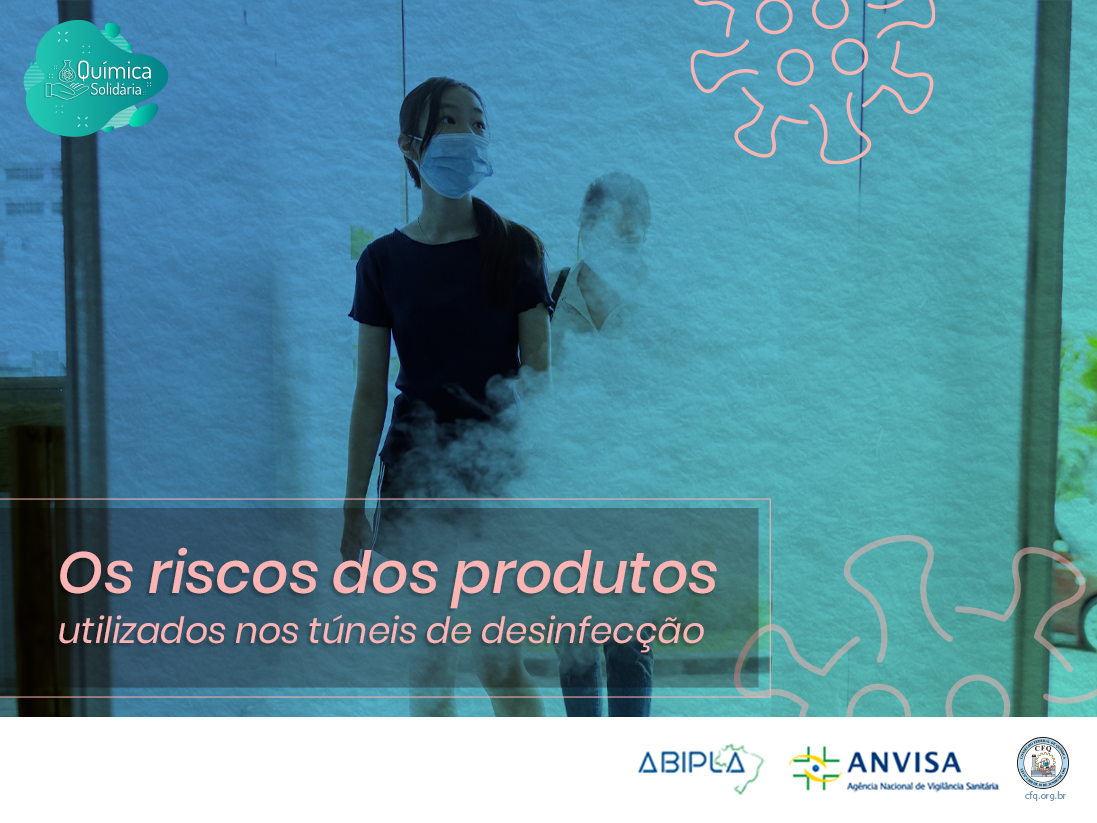 Nesta semana, o Sistema CFQ/CRQs, em parceria com a Abipla e a Anvisa, lança campanha nas redes sociais para alertar a população sobre os túneis/cabines de desinfecção. Nesses equipamentos, são aspergidos produtos desinfetantes e sanitizantes que são destinados à limpeza de superfícies. Segundo a Anvisa, eles podem causar diversos danos à saúde, como irritação na pele e nos olhos, além de reações alérgicas e problemas respiratórios.