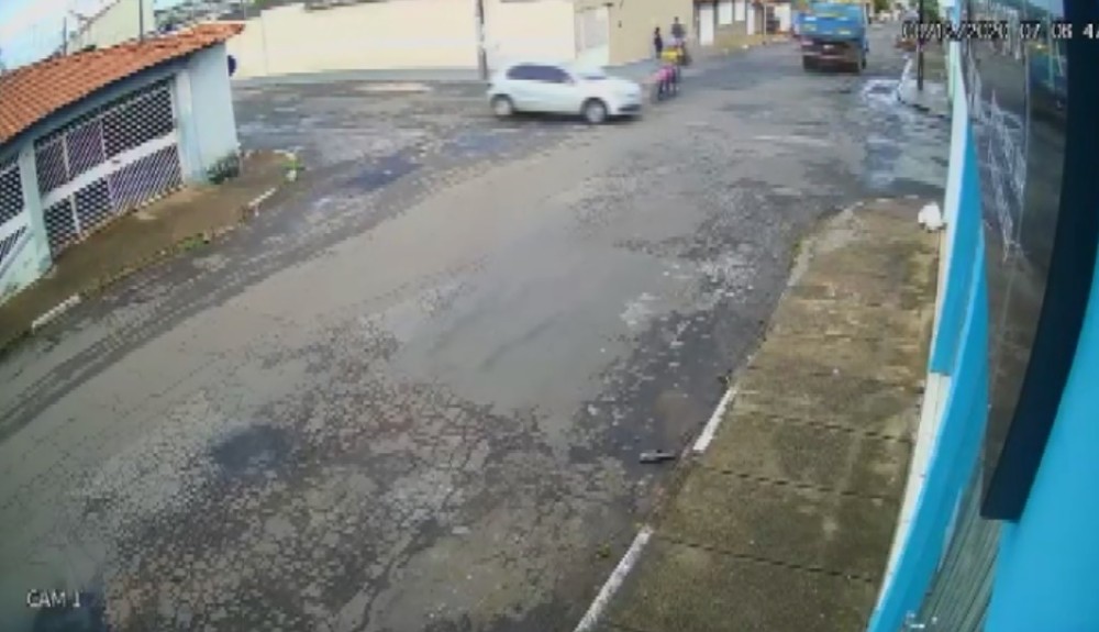 O acidente foi no cruzamento entre as ruas Rio Branco e Piracicaba. O carro espera um caminhão passar e quando arranca é atingido na lateral pela moto. Com a força da batida, o motociclista e a garupa são lançados por cima do carro.