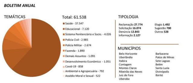 A Ouvidoria-Geral do Estado (OGE/MG) apresentou um balanço positivo das ações da instituição, nesta sexta-feira (18/12). Apesar de 2020 ser um ano desafiador, com a nova realidade imposta pela pandemia da covid-19, o órgão manteve os atendimentos aos cidadãos mineiros, com exceção aos presenciais. O número de manifestações contabilizadas nas nove ouvidorias temáticas e no Canal Coronavírus, somam quase 62 mil registros. Deste total, 1.434 são exclusivas do Canal Coronavírus, novo meio de comunicação, criado pela OGE/MG, em março deste ano, para suprir às demandas de atendimento sobre à atuação dos gestores públicos de saúde e aos equipamentos de proteção individual (EPIs), além de temas relacionados ao coronavírus.