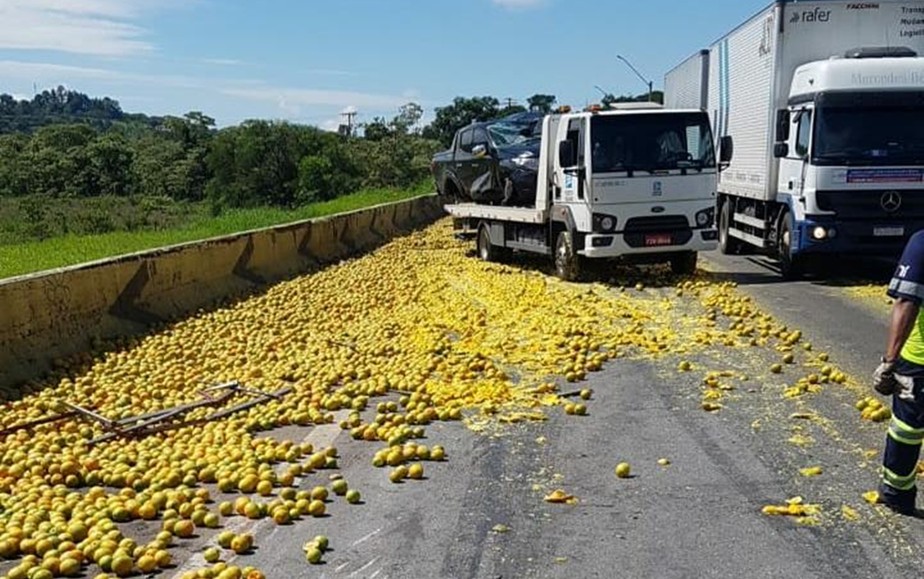 Caminhão carregado com laranjas tomba na BR-381
