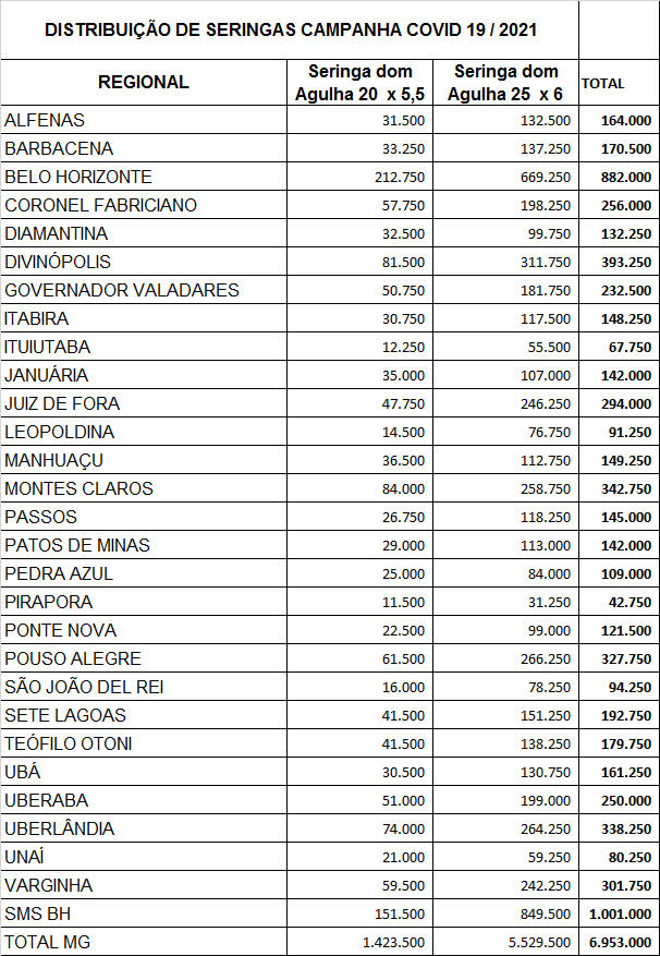 Cerca de 7 milhões de seringas agulhadas que servirão para a vacinação contra a covid-19 estão a caminho ou já chegaram a 21 das 28 Regionais de Saúde do Estado de Minas Gerais. E, até a próxima segunda-feira (18/1), todas as regionais já devem receber esses materiais.