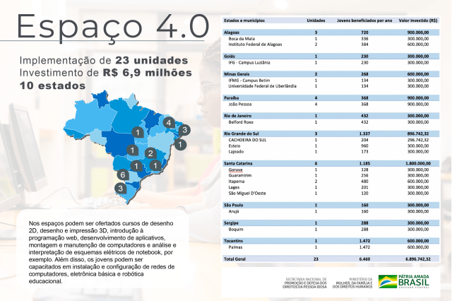 A implementação de 23 unidades do Espaço 4.0 foi firmada pelo Ministério da Mulher, da Família e dos Direitos Humanos (MMFDH) em 2020. Com investimento de R$ 6,9 milhões, o Governo Federal vai levar o projeto para 10 estados brasileiros. Os municípios que recebem as unidades são equipados com tecnologia de última geração para a capacitação de jovens em vulnerabilidade social.