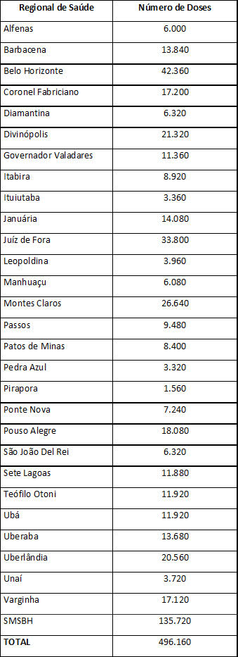 Confira, a seguir, tabela com quantitativo de doses para as unidades regionais de saúde: