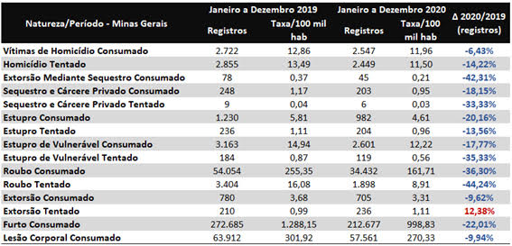 Os crimes violentos caíram 32,92% em Minas Gerais ao longo de 2020, na comparação com o mesmo período do ano anterior. Os dados representam um total de 22.748 crimes a menos em todo o estado em relação a 2019 e foram divulgados nesta sexta-feira (12/2) pelo governador Romeu Zema, em suas redes sociais. Dentre os 15 índices monitorados mensalmente pelo Observatório de Segurança Pública, 14 apresentaram redução. No comparativo com 2018, a queda da criminalidade violenta chega a 51,26%.